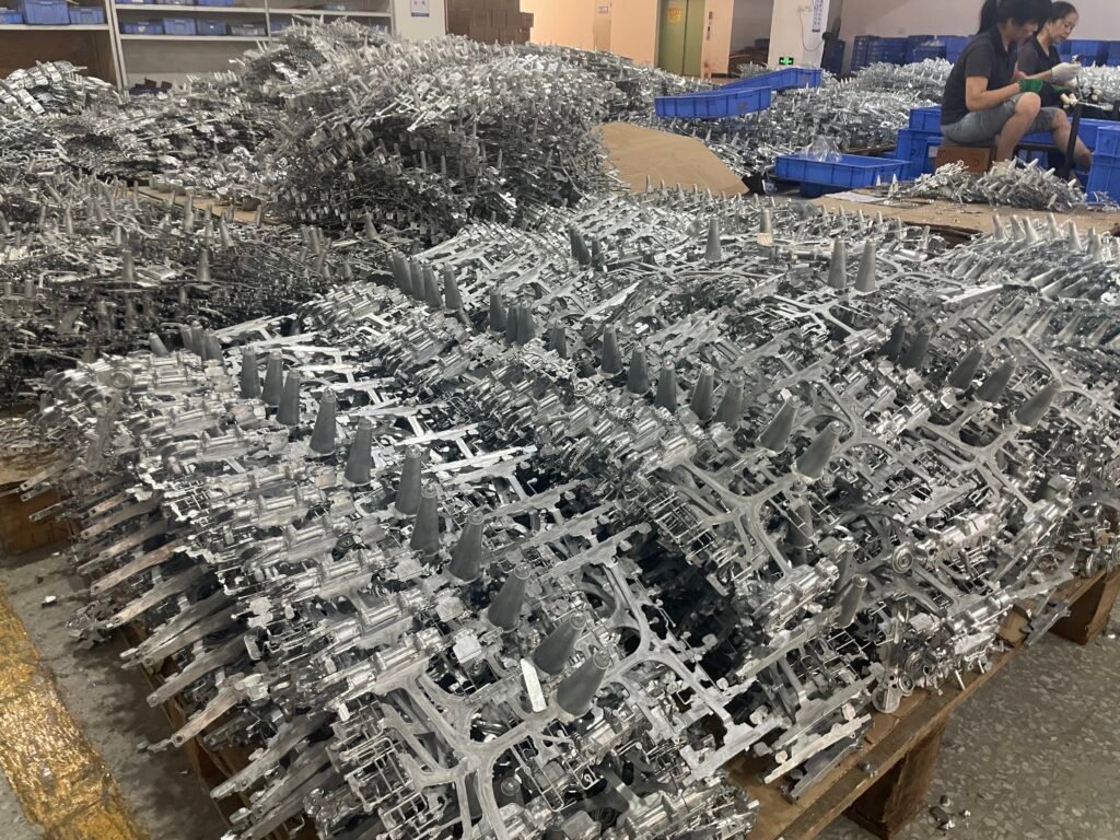 After the alloy parts are produced, there are excess materials from the gates and runners that are no longer needed. We use mechanical processes, such as metal stamping presses and manual die-cutting machines, to remove these unwanted sections.