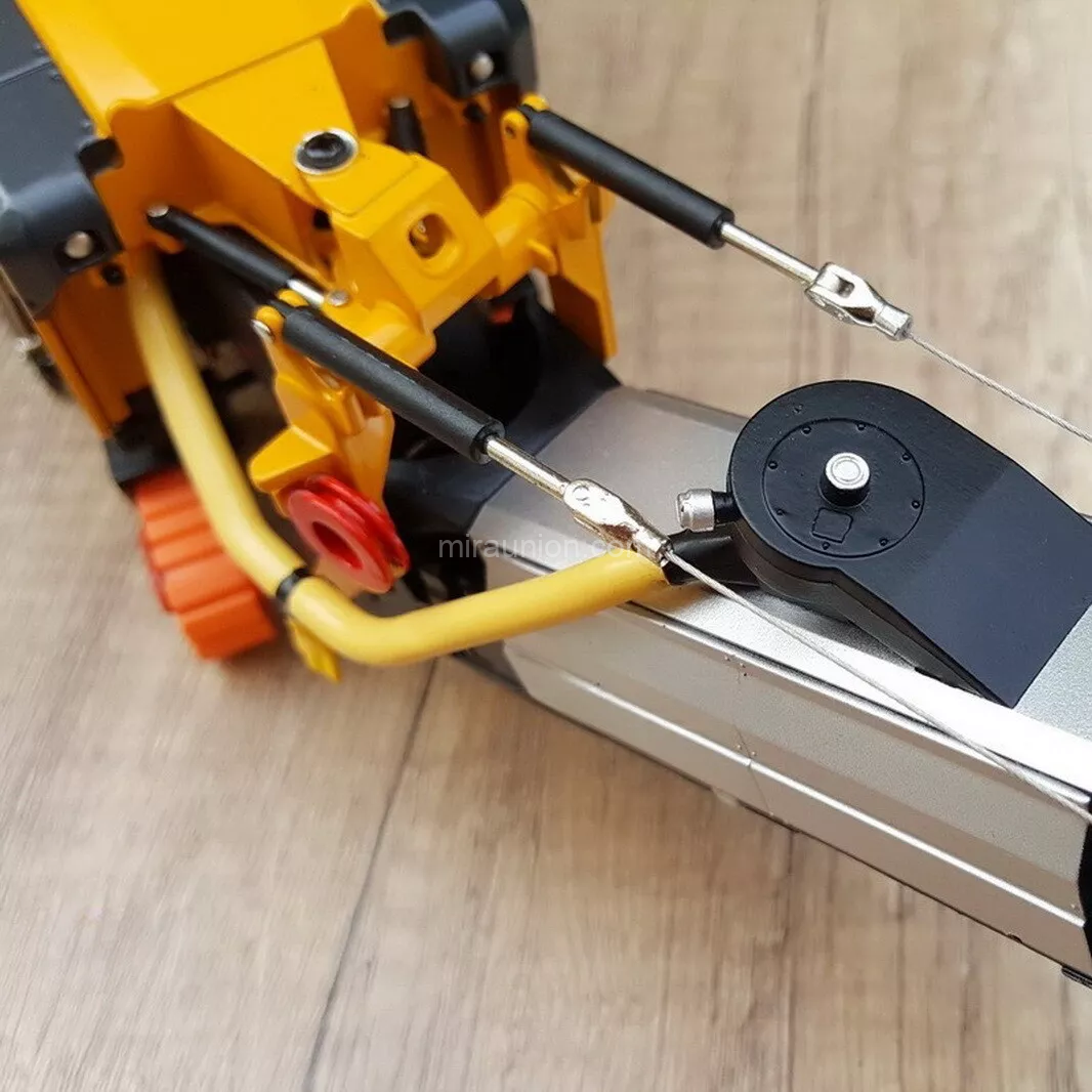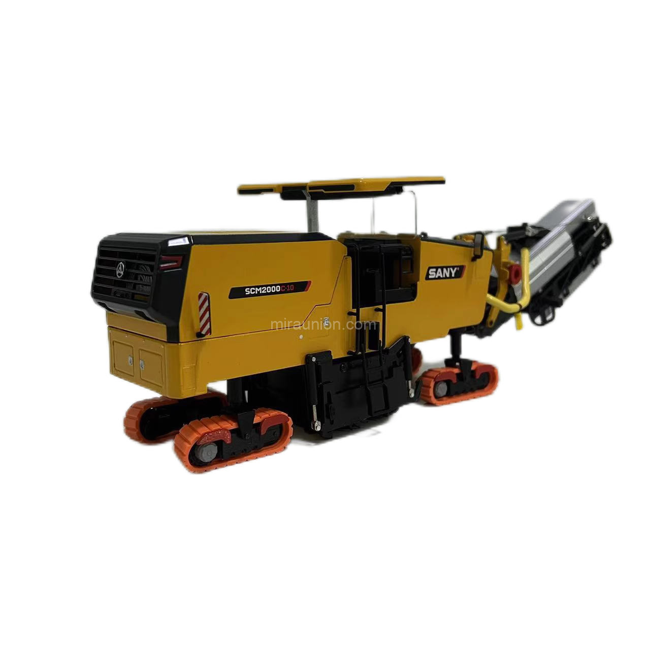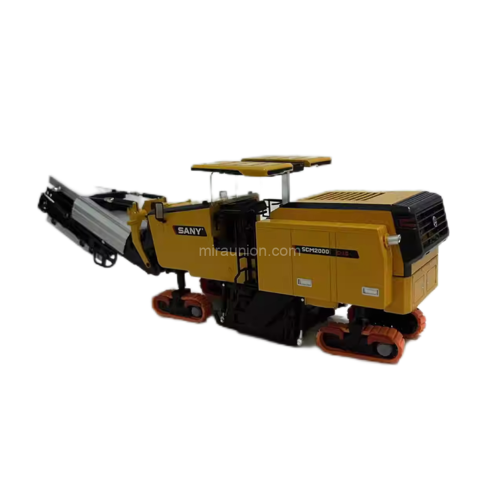 Both left and right milling side panels can be adjusted up or down, mimicking the precise control needed for road milling operations. This functional detail highlights the model’s commitment to realism.Rotating Tracks & Adjustable Track Frames