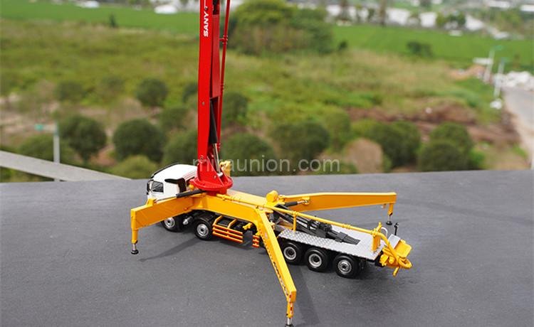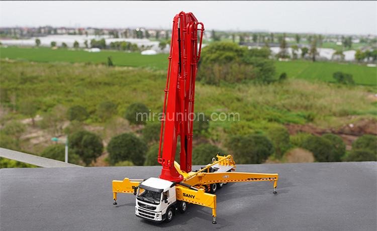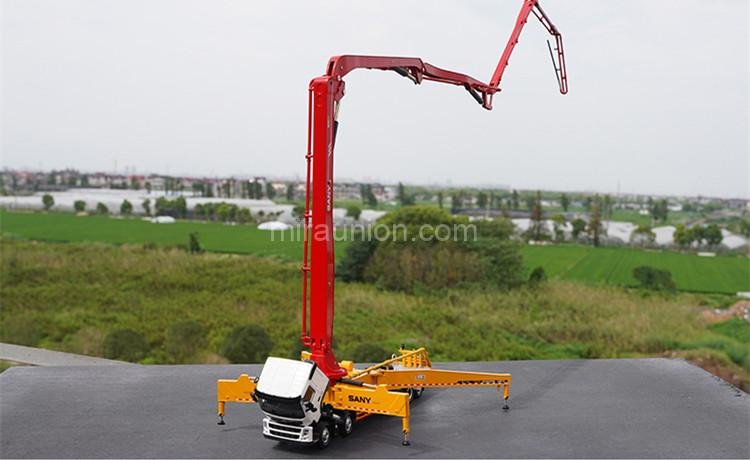 The front grille, headlights, and bumper are finely replicated to match the original SANY truck’s industrial design. The engraved logo and textured elements add to the authenticity of the pump truck model.