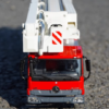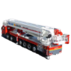 The fire truck model features a fully extendable aerial platform reaching up to 1.25 meters, deployable stabilizing outriggers, and opening cabin doors. The rotating ladder and extendable boom mimic real-life firefighting operations, offering dynamic display options.